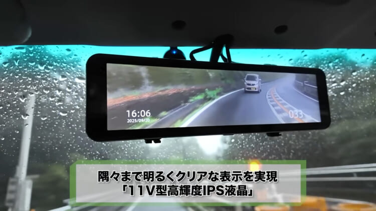 さらに、悪天候時にもその効果を発揮します。リアカメラが車内側に設置されているため、雨が降っても通常のミラーのように水滴で滲むことがなく、ワイパーを動かせばクリアな視界が維持されます。また、カメラにはSTRVIS2技術搭載ソニー製CMOSセンサーの採用により、少ない光量でも夜間の撮影が可能ということと、HDR機能は夜間走行時に起きやすい白飛びや黒つぶれを抑える機能も備わっているため、暗いトンネル内や山道でも後方がしっかり見え、運転の安心感を高めてくれます。モニター自体にも映像の滲みを抑えるエアギャップレス式が採用され、鮮明な映像を提供します。