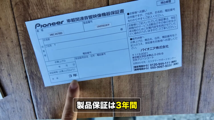 製品には3年間の製品保証が付いており、万が一の際にもしっかりとしたサポートが受けられる点は、カロッツェリアならではの強みと言えます。