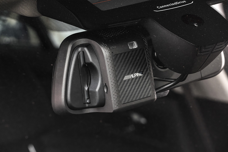 ミラー背面にはカーボン調の装飾にアルパインのロゴを施してアクセントをプラス。スポーティな雰囲気を押し上げ、BMWのDNAである“駆け抜ける歓び”をさりげなく表現しています。