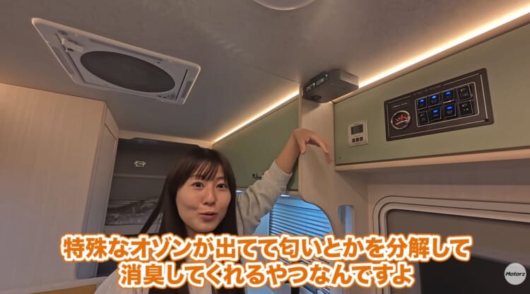 夕食には名古屋名物の「名古屋コーチン」を調達し、車内で温め直して堪能する夫婦の姿がありました。調理後の匂い対策にはオゾン発生器を活用しており、ソファーに染み付きがちな匂いも強力に分解されるため、翌朝も清々しく目覚めることができます。