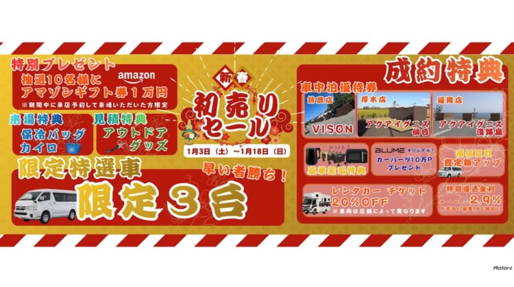 最後に、キャンピングカーファンにとって見逃せないニュースがあります。カムラフウフが旅の相棒としている「オステリア」のビルダーであるダイレクトカーズでは、新しい年の始まりを祝う「初売りセール」が開催されます。