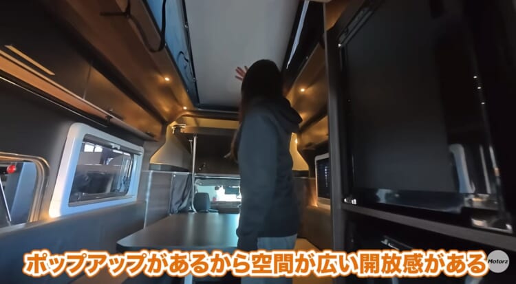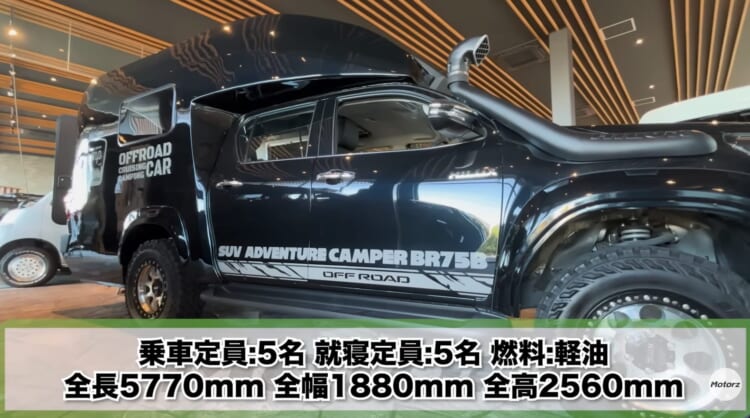 今回カムラフウフが特に注目したのは、トヨタのハイラックスをベースにしたキャブコン「BR75」です。2023年度のグッドデザイン賞を受賞したスタイリッシュな外観は、まさに大人の秘密基地を体現しています。乗車定員・就寝定員ともに5名を確保したこの車両は、車内に入るとポップアップルーフによる圧倒的な開放感が広がり、170cmの大人が立っても余裕のある高さが魅力です。