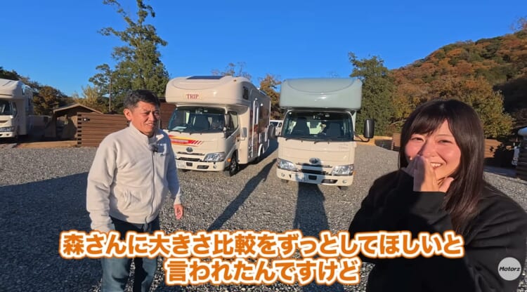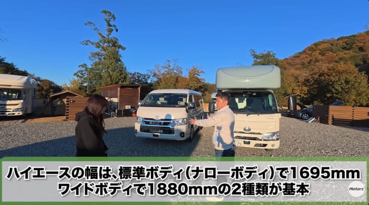 旅の途中で合流したMotorzの森からは、気になるキャンピングカーのサイズ選びについてもアドバイスがありました。カムラフウフが現在乗っているショートキャブコンの「オステリア」は、ハイエースのワイドミドルルーフと全長・全幅がほぼ同等であるため、キャブコンの中では比較的取り回しがしやすいモデルです。ハイエースのワイドボディを運転できる方であれば、それほど難しくなく扱えるサイズ感と言えます。