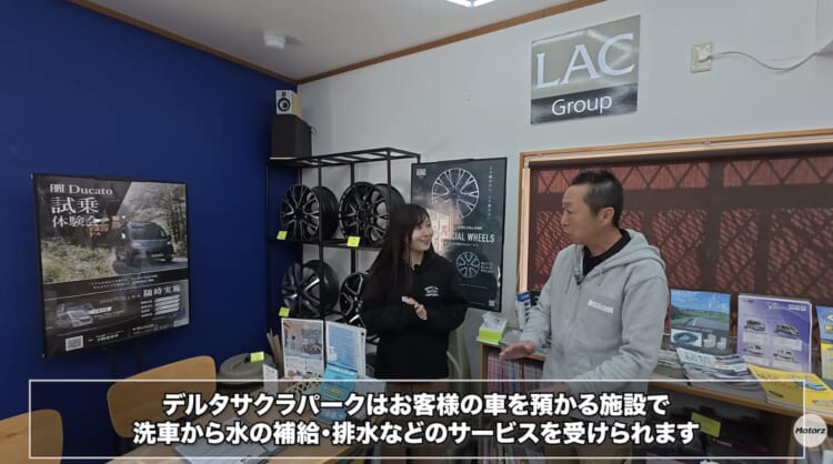 ここで注目すべきは「サクラパーク」というサービスです。これはお客様のキャンピングカーを預かるモータープールのような場所なのですが、単なる駐車場ではありません。旅の前の給水や帰着後の排水、さらには高圧洗車機による洗車まで、すべてこの場所で完結できるのです。自宅に駐車スペースやメンテナンス環境がない方にとっては、夢のようなサービスではないでしょうか。