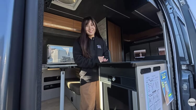 車内に入ると、高級感のあるレザー調シートがお出迎え。エアコン、トイレ、FFヒーター、IHクッキングヒーターといった快適装備がすべて標準で付いているというから驚きです。特筆すべきは冷蔵庫で、なんと両開き仕様。車内からはもちろん、外からもアクセスできるため、キャンプ中の食材の出し入れが非常にスムーズに行えます。全長5,410mmというサイズ感ながら、マルチルームや充実した収納を備え、二人旅には最適な一台といえるでしょう。
