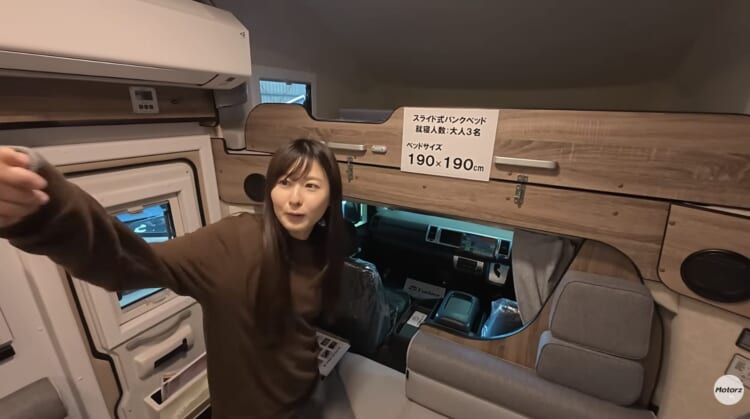 続いて紹介されたのは、全長7mを超える大型キャブコン「サンリビング(Sun Living)」です。こちらは乗車・就寝ともに6名という余裕のスペック。車内に足を踏み入れると、高い天井と天窓のおかげで開放感があふれています。