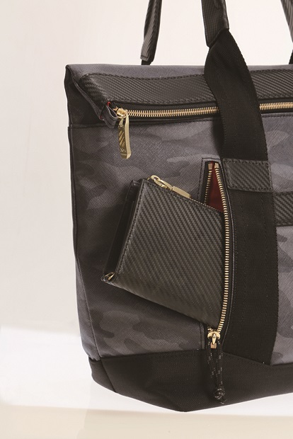 外はカモフラカーボン柄に、バッグとあわせたファスナーなど、ゴールドのメタルパーツを使用。