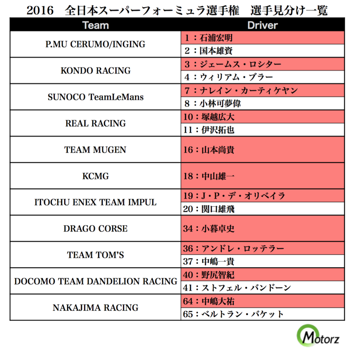 GT300は入れ替わりが激しいので、今回はGT500のみですが、対応表は以下。